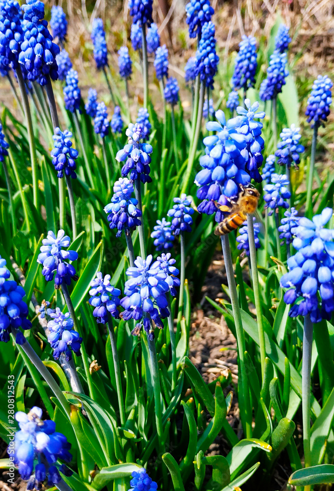 Wasp among beautiful blue flowers