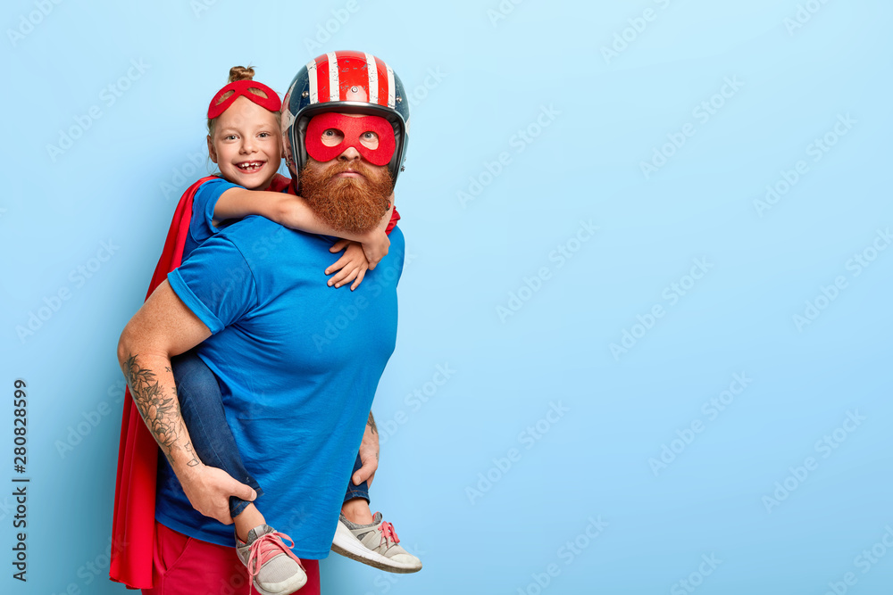 Horizontal shot of caring father gives piggyback to small child, play interesting superhero game, wear special costumes, pose against blue background with free space, have great impact on world