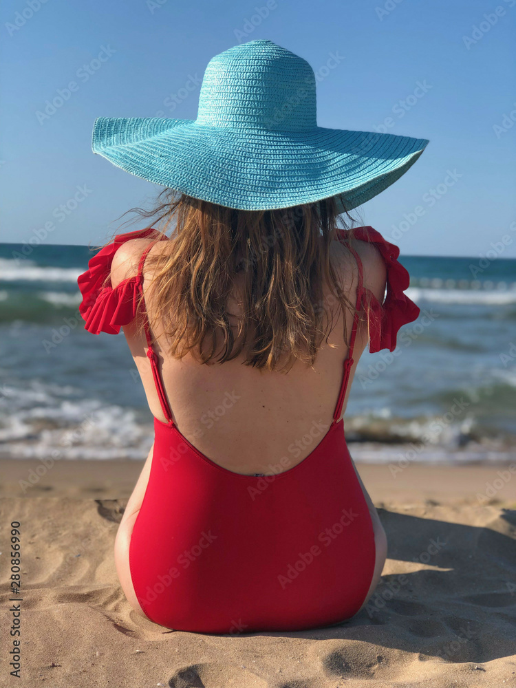 Girl in a red one-piece swimsuit on the sandy beach of the sea coast at sunset
