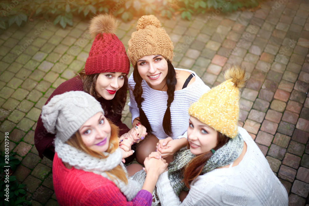 Girls in warm knitted clothes and hats hug, top view. Autumn day, a group of friends.