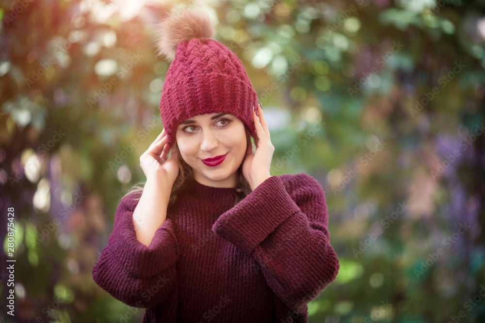 Happy lifestyle portrait of a beautiful young model girl with a smile in a warm autumn hat.
