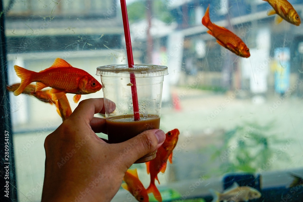 金魚の街 大和郡山 コーヒーと浮遊する金魚 Goldfish Town Yamatokoriyama Nara Floating Goldfish