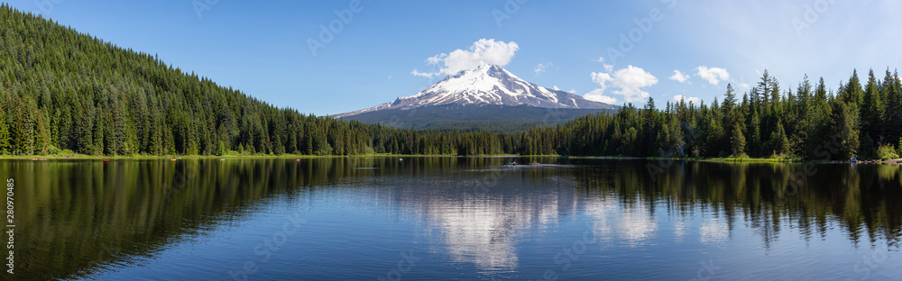 Beautiful Panoramic Landscape View of a Lake with Mt Hood in the background during a sunny summer day. Taken from Trillium Lake, Mt. Hood National Forest, Oregon, United States of America.