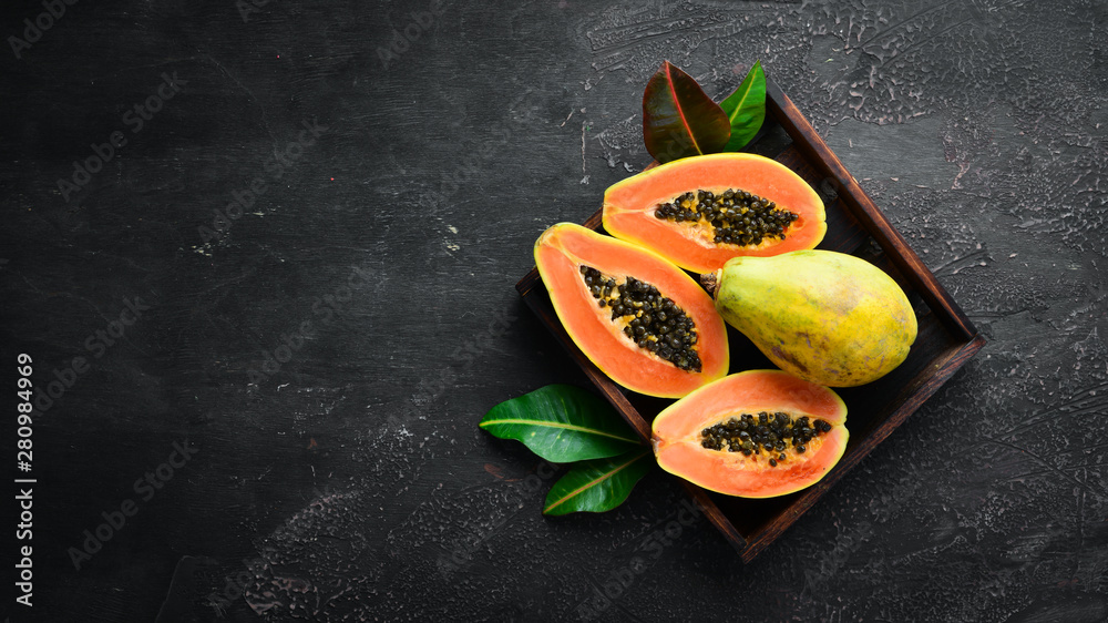 Papaya fruit on a wooden background. Tropical Fruits. Top view. Free space for text.