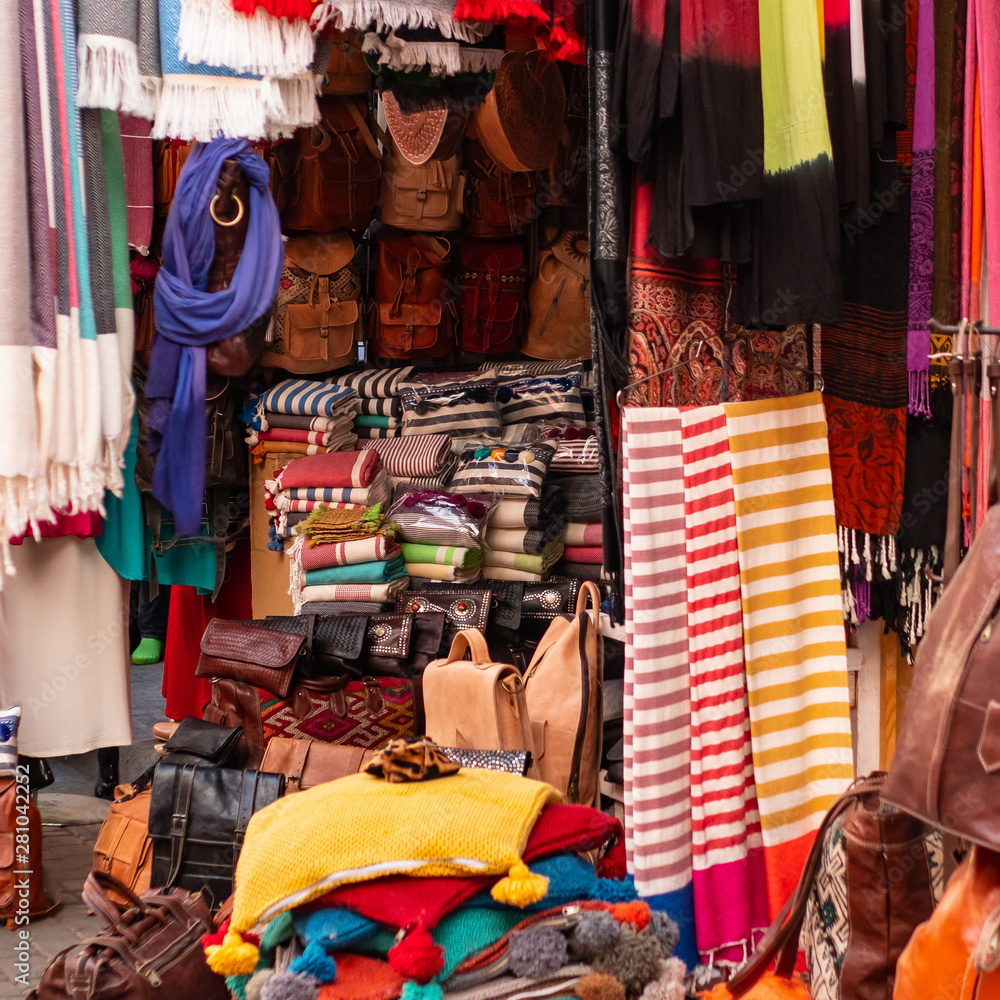 Traditional african arabian moroccan marrakech carpet market, shop with carpets and textile marketplace