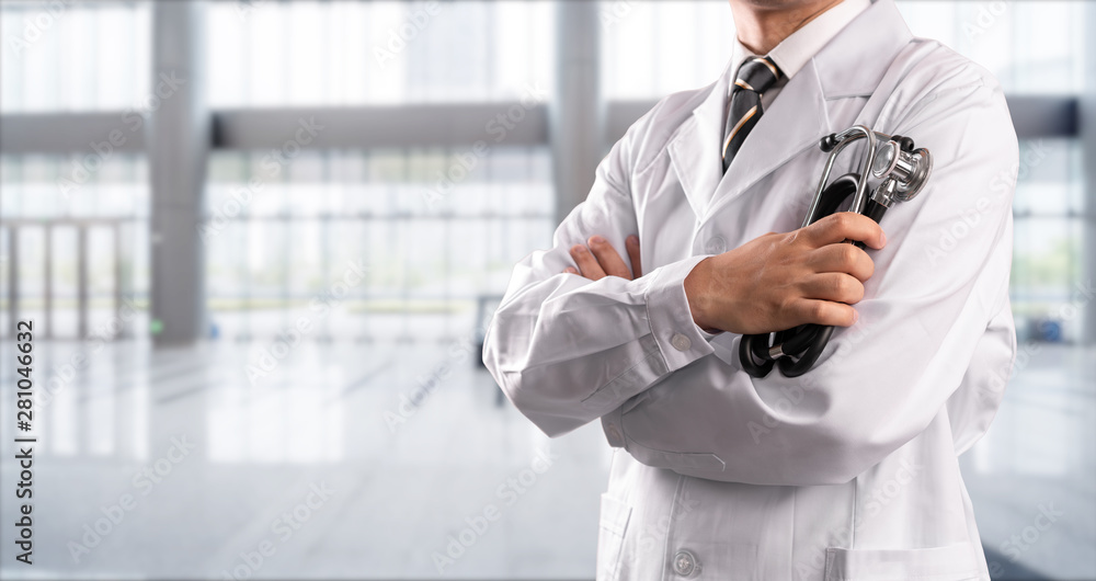 young doctor with hospital background