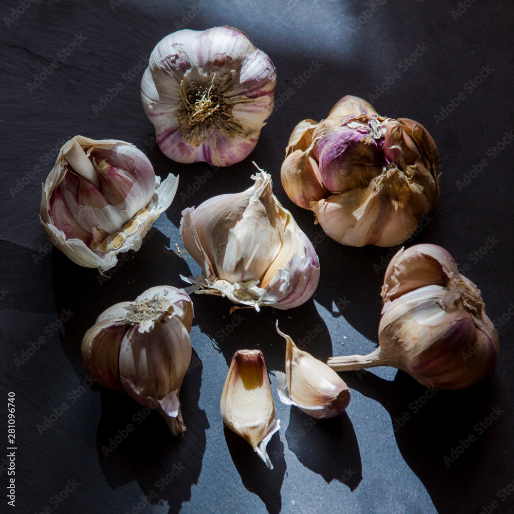 Unas cuantas cabezas de ajo morado sobre una superficie de pizarra negra