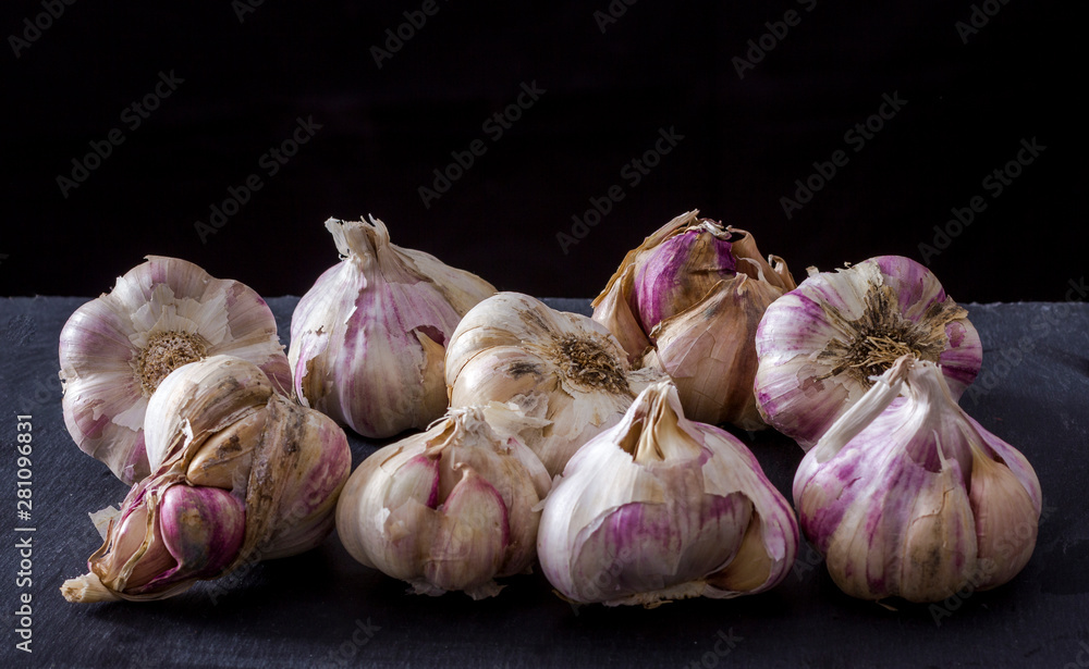 Unas cuantas cabezas de ajo morado sobre una superficie de pizarra negra