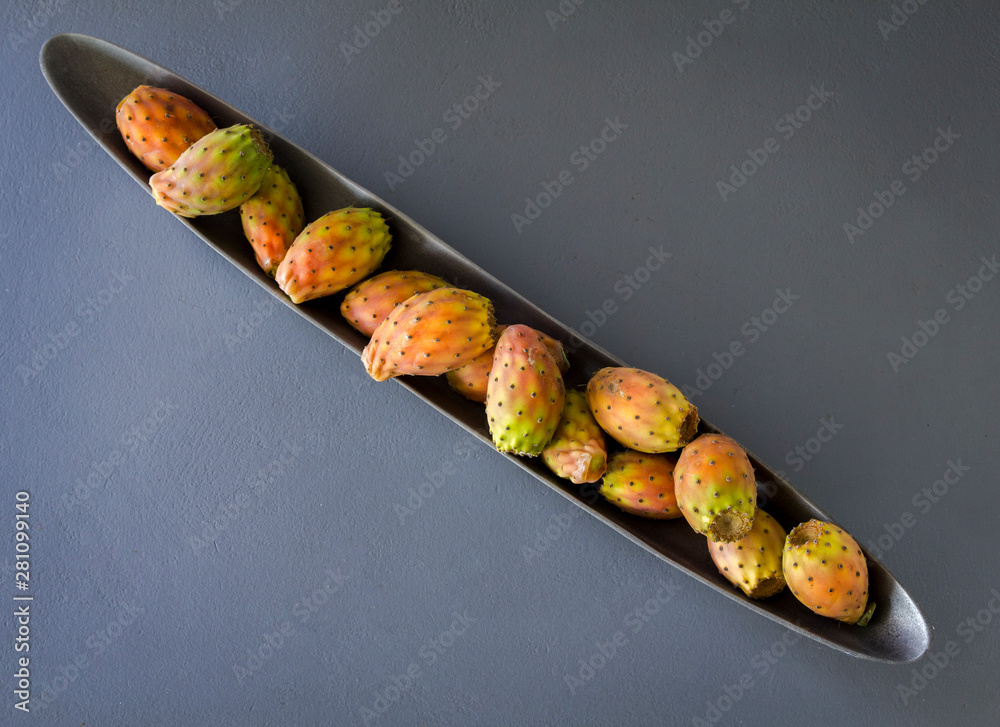 Higos chumbos en un recipiente metálico alargado, formando una composición diagonal