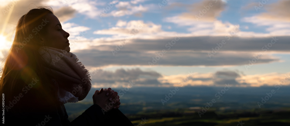 Christian worship and praise. A young woman is praying and worshiping in the evening.