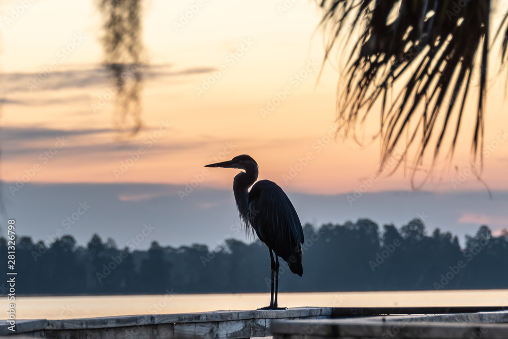 Silhouette of a great blue heron watching the sunrise view