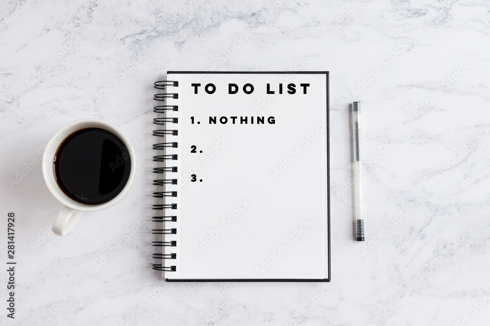 To do list nothing writing on notebook. Notebook on desk with coffee cup and a pen.