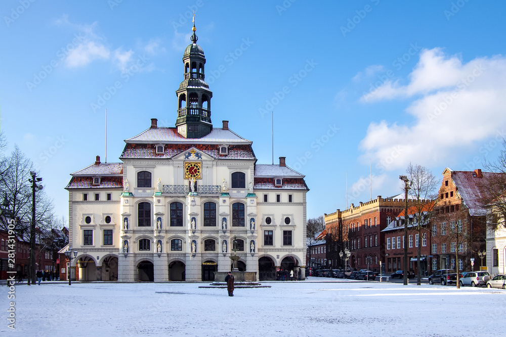 Rathaus Platz Lüneburg im Winter entzerrt sonnig