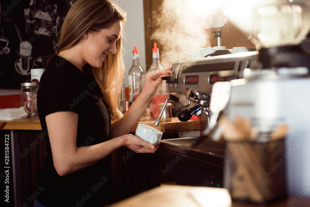 female barista making coffee in coffee shop counter. Barista female working at cafe