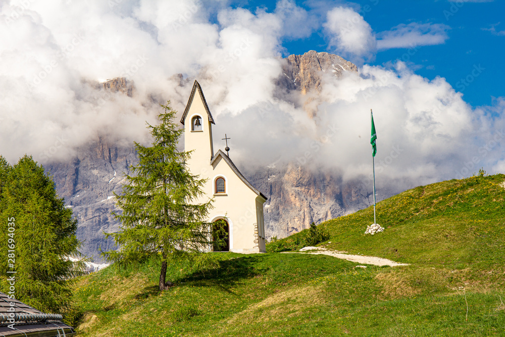 San Maurizio chapel on the passo di val Gardena with mountain view in background. Colorful view in pass Sella in summer sunny day . Alps, Dolomites, Groeden, Bolzano, Trentino Alto Adige, Italy