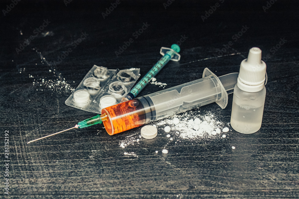 Syringe with drugs (heroin) and pills and powder on the table. Drug addiction.
