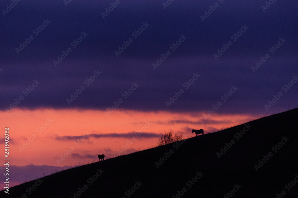 Distant horses silhouettes over a mountains against a beautiful coloured sky at dusk