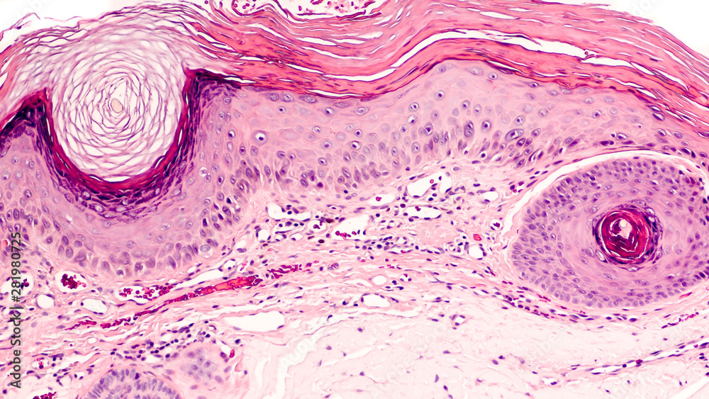 Skin biopsy of an actinic (solar) keratosis, common on sun-damaged skin and a precursor of squamous cell carcinoma (cancer). Sunscreen can be prevent these lesions from occurring.