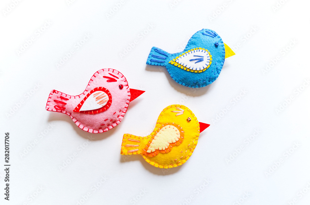 Yellow, pink and blue felt bird workshop. Happy Easter holiday.
