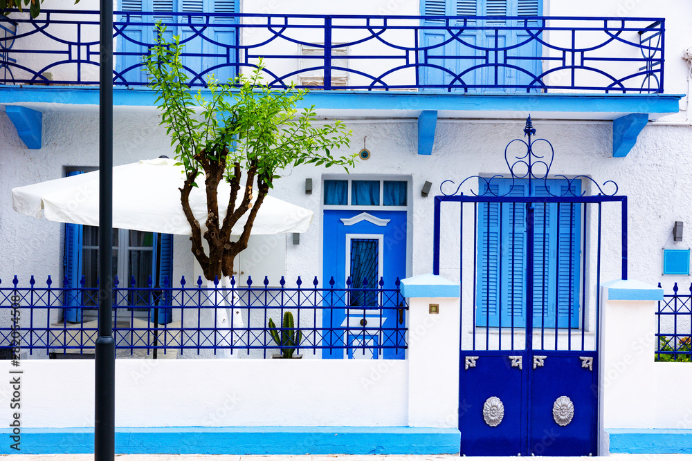 Detail of colorful mediterranean house facade. Traditional blue and white house exterior.