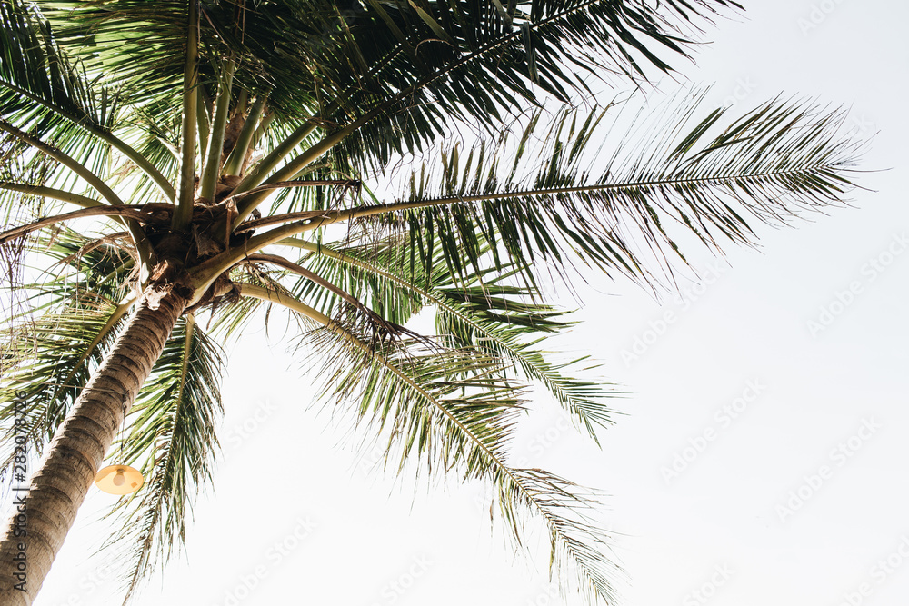 Summer tropical green palm tree against white sky. Isolated minimal wallpaper.Summer concept on Phuket, Thailand.