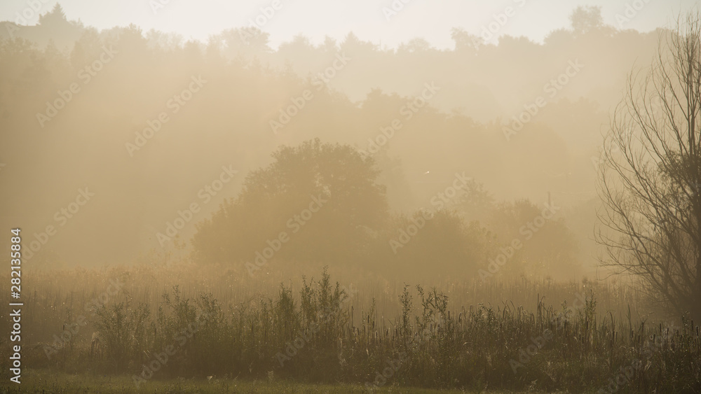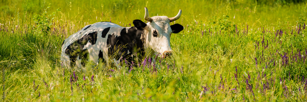 Domestic cow on pasture, in the afternoon in the meadow among the herbs.