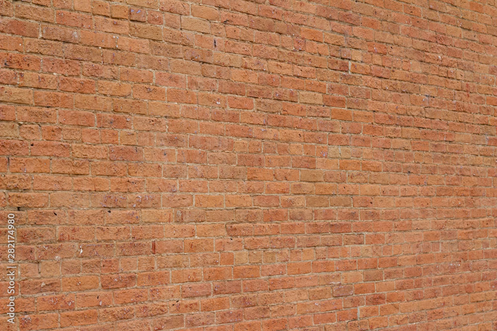 Old reddish orange brick wall background with cracks and worn texture (angle view)