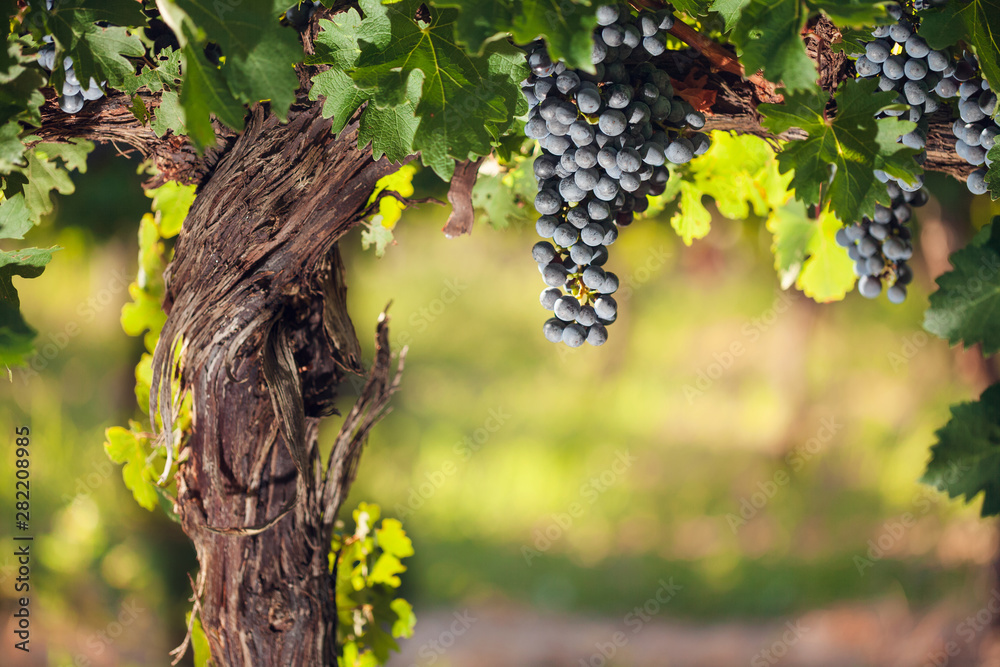Wine grapes on a beautiful old grapevine with colorful vineyard backlighting and copy space.