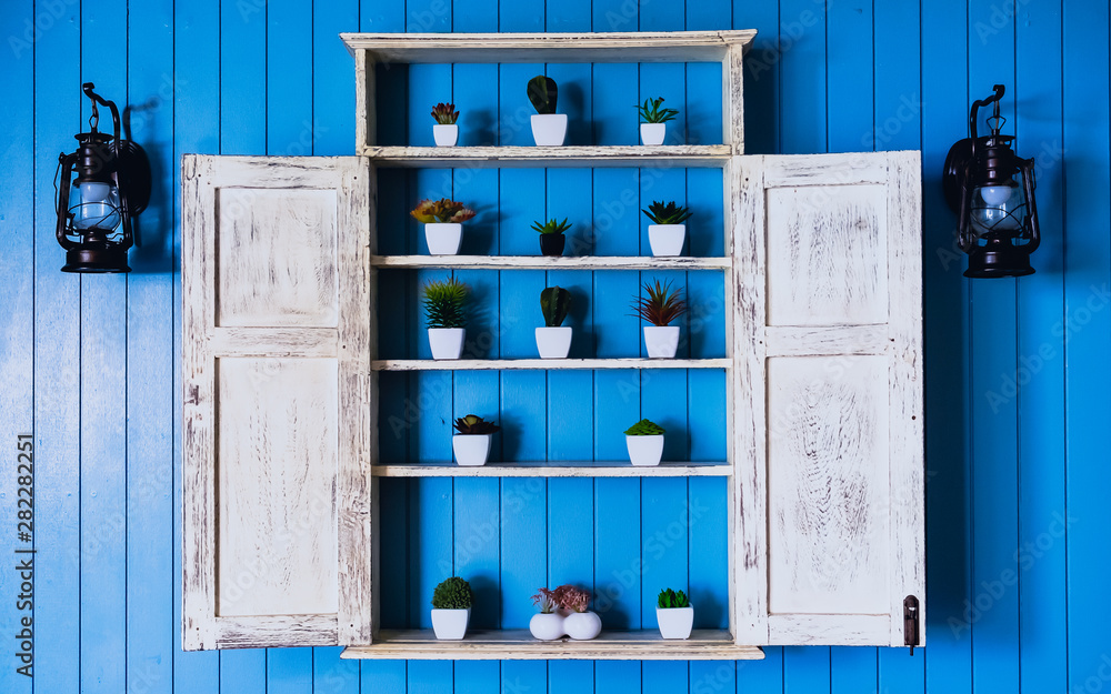 pastel blue wooden wall decorated with small plants on the white shelves with the frame as the window open