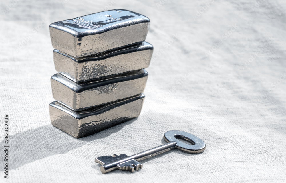 Silver bars and the key to the safe against a rough texture of the light coloured fabric.