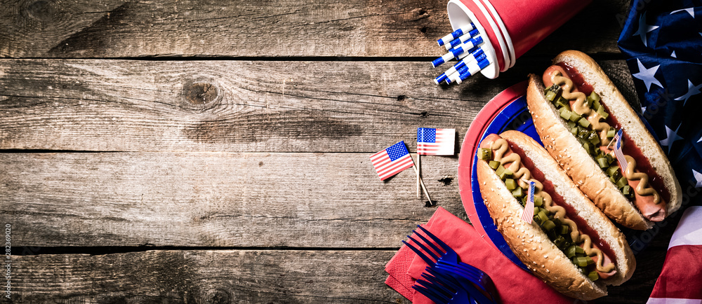 USA national holiday Labor Day, Memorial Day, Flag Day, 4th of July - hot dogs with ketchup and mustard on wood background