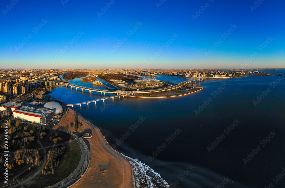 Saint-Petersburg, Russia - 14 april 2019: Beautiful view to new Stadium Zenit - Arena, highway, Gulf of Finland, Pedestrian bridge on sunny summer day. Top panoramic view aerial drone. St. Petersburg