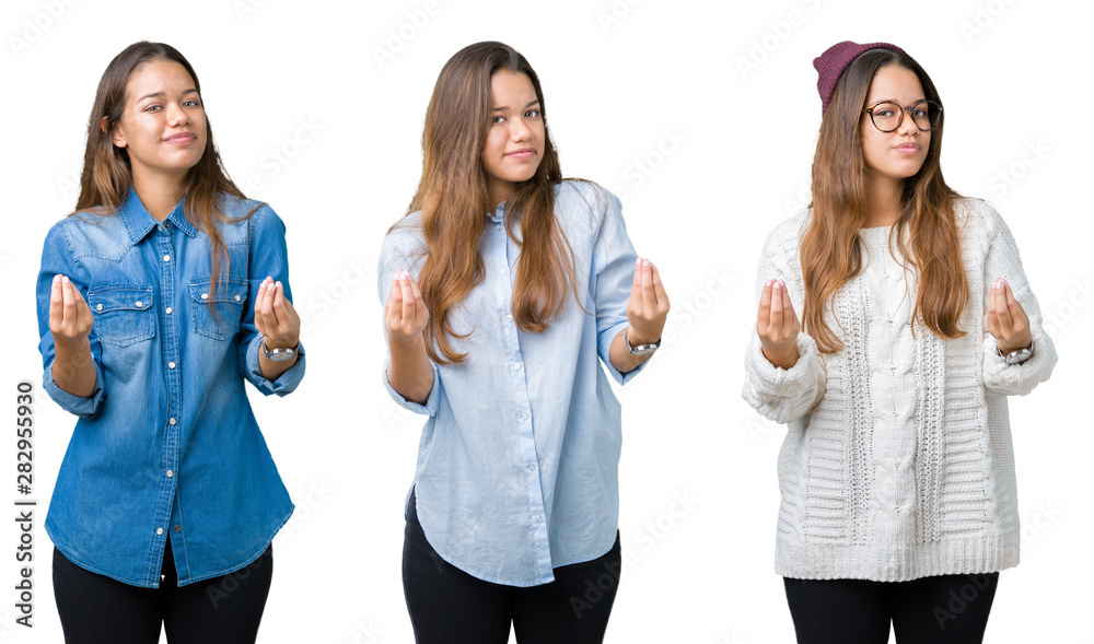 Collage of beautiful young woman over isolated background Doing money gesture with hand, asking for salary payment, millionaire business