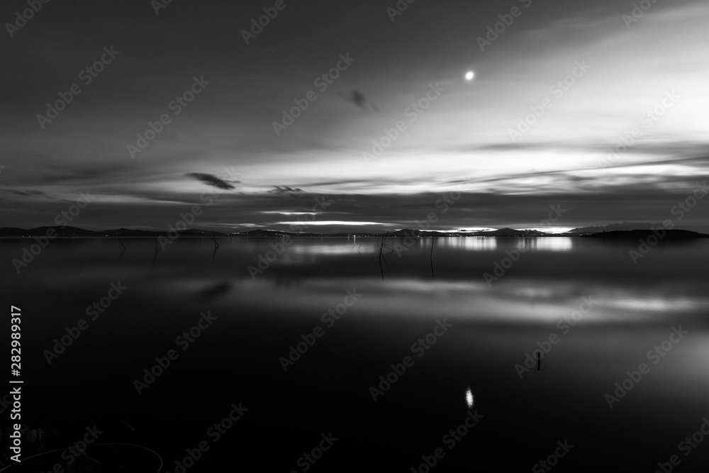 Moon above a lake with its reflection on the Trasimeno lake surface at dusk