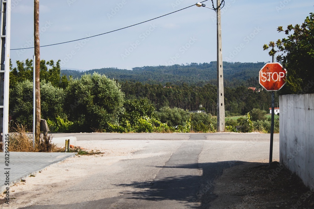 Stop sign with a beautiful background. Peaceful rural area view. Summer holidays feeling.