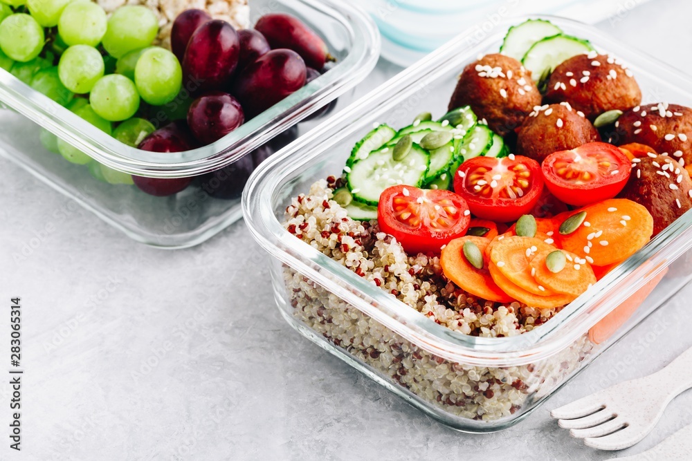 Meal prep lunch box containers with quinoa, meatballs cucumbers, carrots and pumpkin seeds