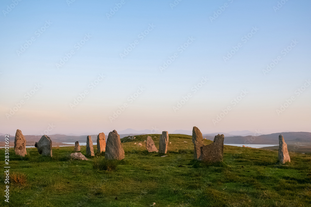 Callanish III site at dusk, famous site of standing stones from 4000 years ago.