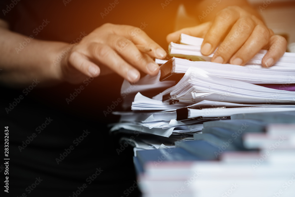 Business documents paperwork overwork concept : Employee people hands working in stacks paper files for searching and checking unfinished document report on folders print at busy work desk office.