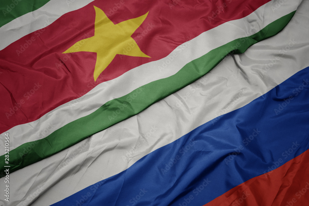 waving colorful flag of russia and national flag of suriname.