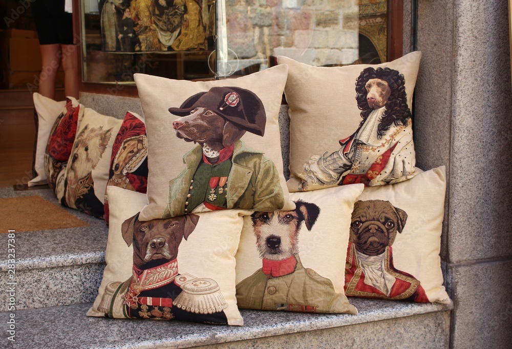 pillows with dogs in the shop window, images of different dogs on the pillow