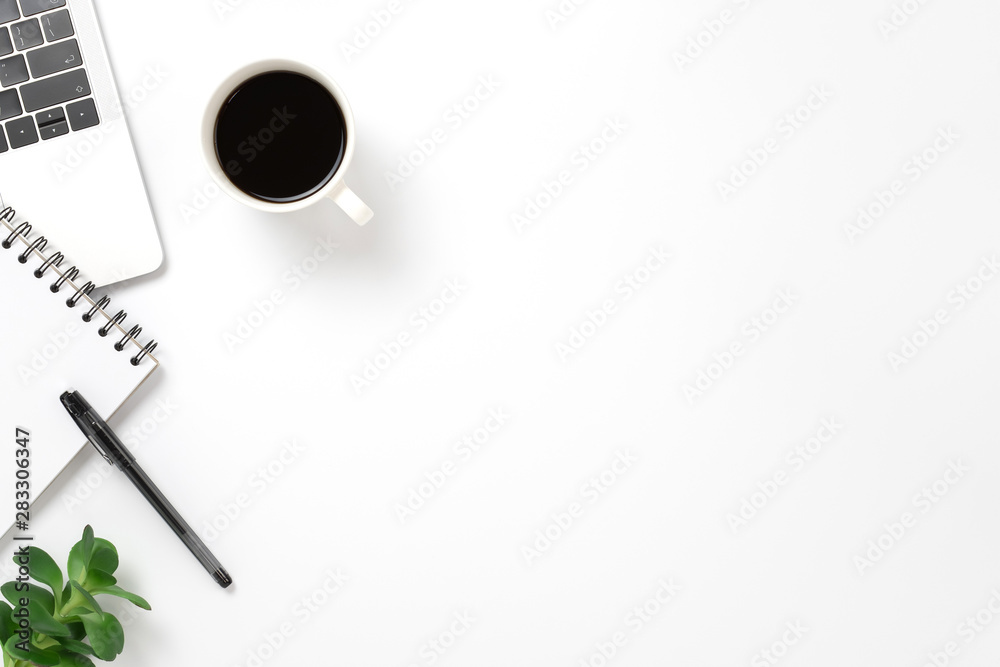 office desk with laptop, coffee cup, blank notepad, pen and green leafs on white.