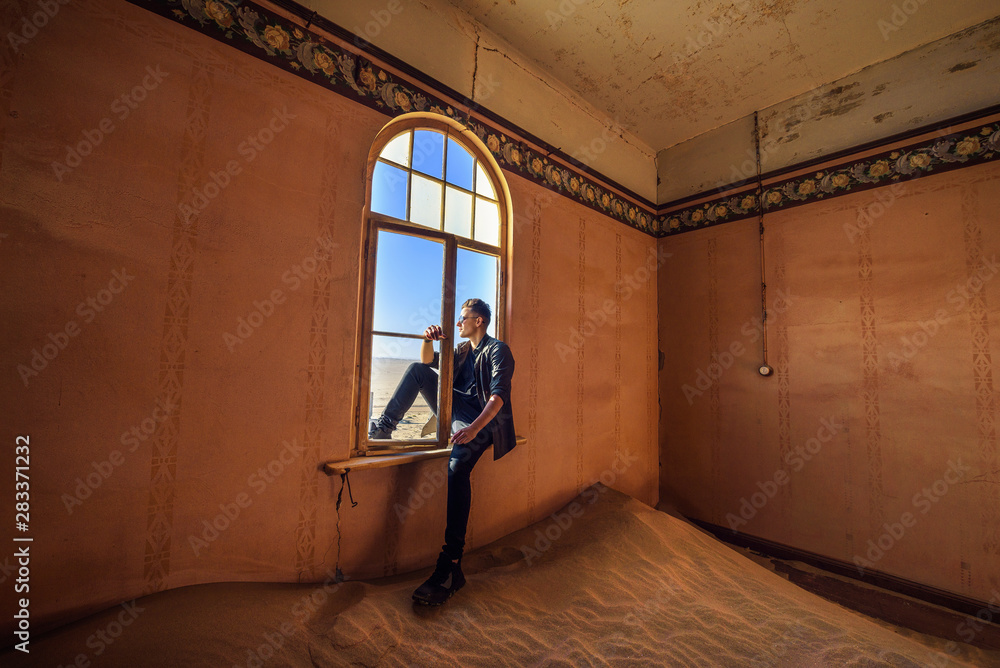 Tourist sits in the window of a room in the ghost town Kolmanskop, Namibia