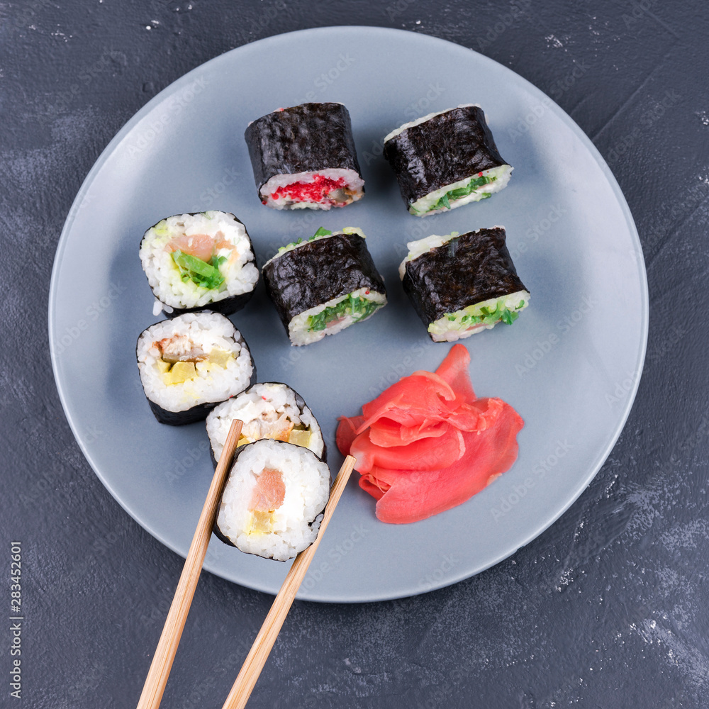 Sushi roll with chopsticks large on a plate background with rolls top view