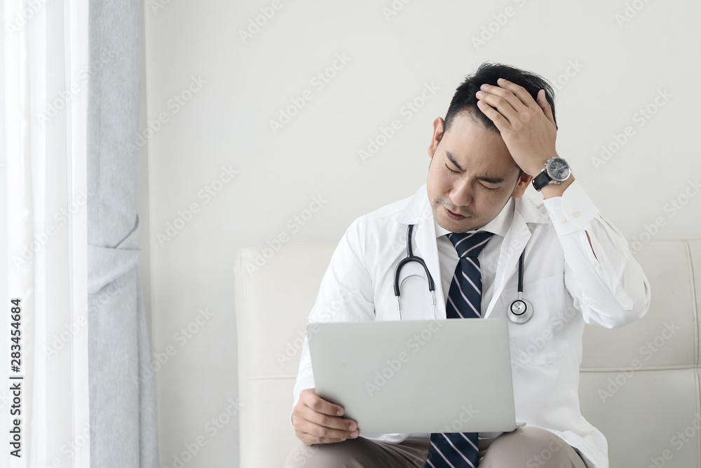 Asian doctor feeling headache while working with laptop in clinic, lifestyle concept.