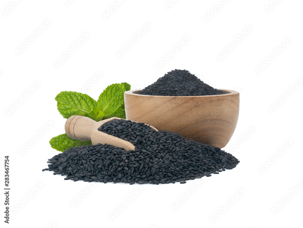 Black Sesame seeds in wooden bowl and spoon isolated on white background.Organic natural sesame seeds and extract oil concept
