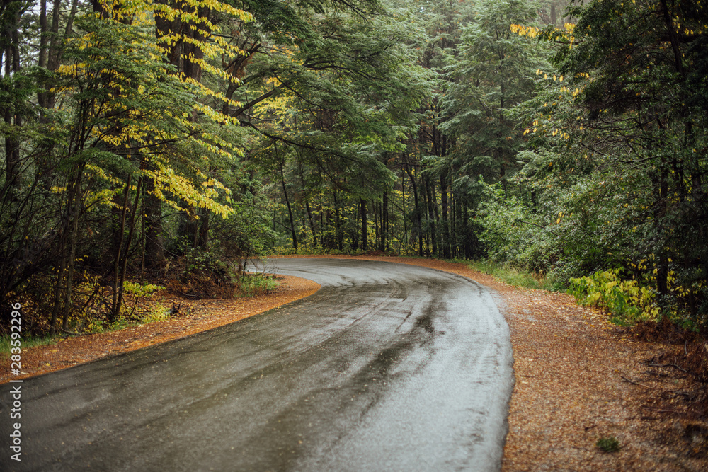 Wet road surrounded by the Patagonian forest, in the Circuito Chico de Bariloche, in the province of Rio Negro, Argentina