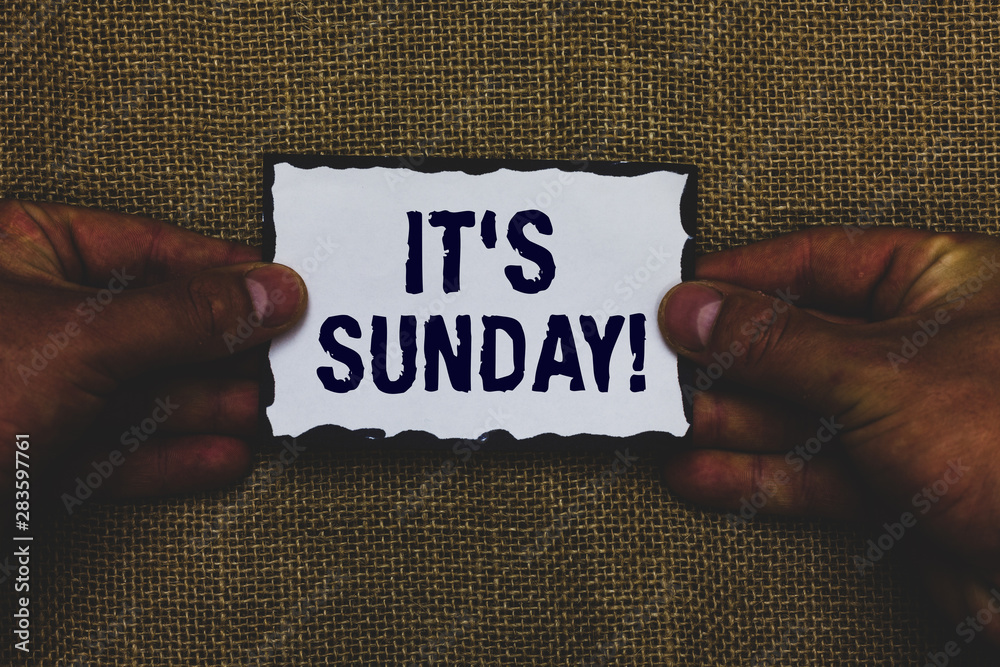 Handwriting text It s is Sunday. Concept meaning Day of rest and religious worship Part of the weekend Man holding piece paper black borders jute background Communicate ideas