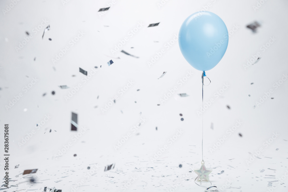 Blue balloon surrounded by silver confetti on white background. Birthday and holidays background.