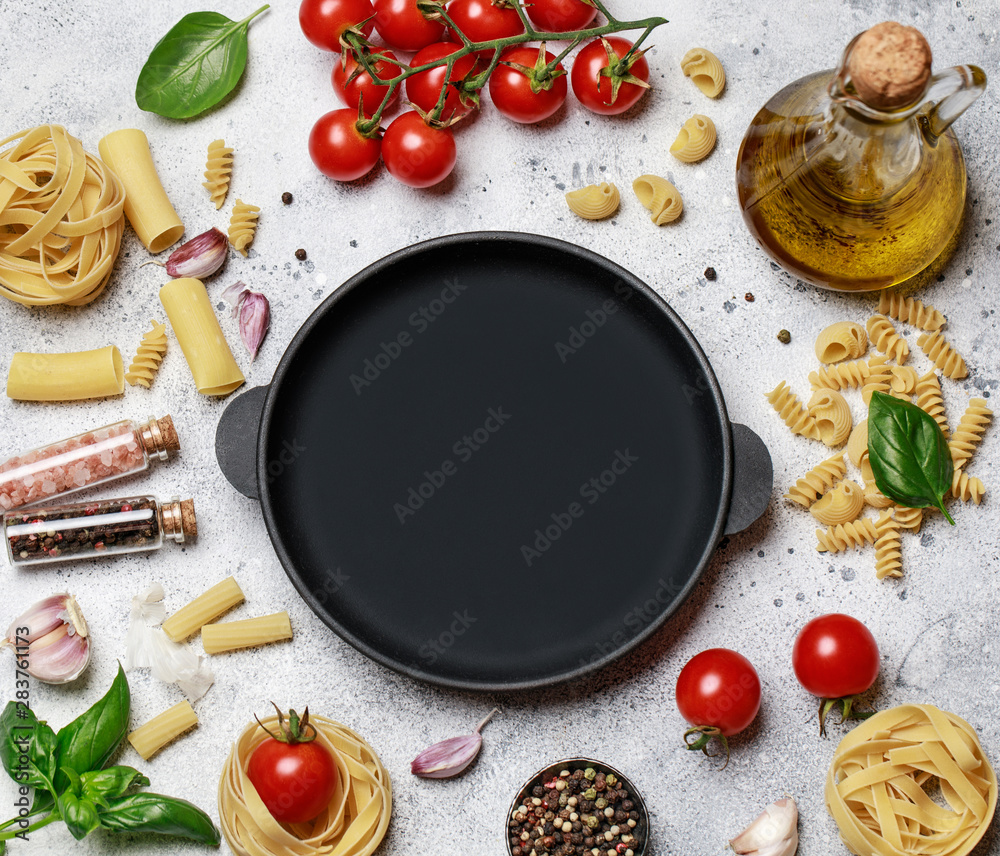 Uncooked pasta on grey stone background. Top view. Raw pasta with ingredients for cooking. Food concept. Italian food
