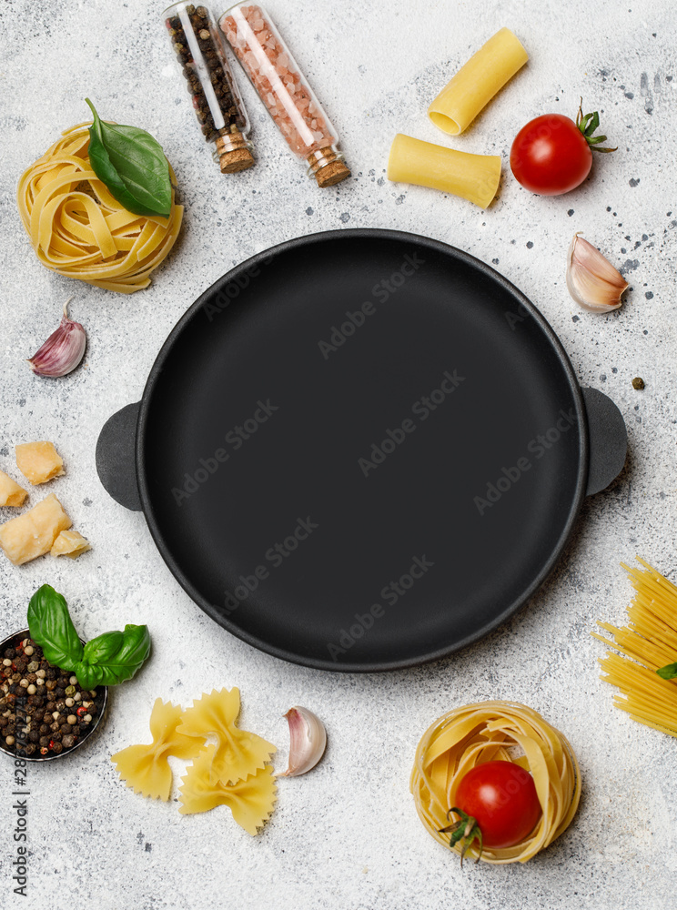 Uncooked pasta on grey stone background. Top view. Raw pasta with ingredients for cooking. Food concept. Italian food